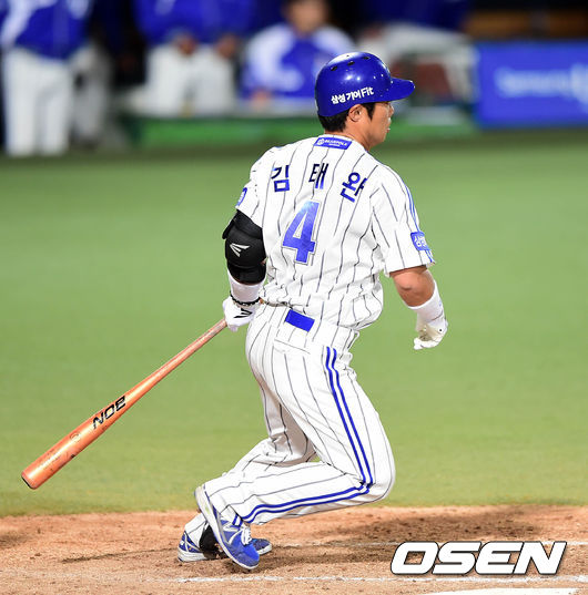 7회말 2사 1,2루에서 삼성 김태완이 좌전 적시타를 치고 있다.