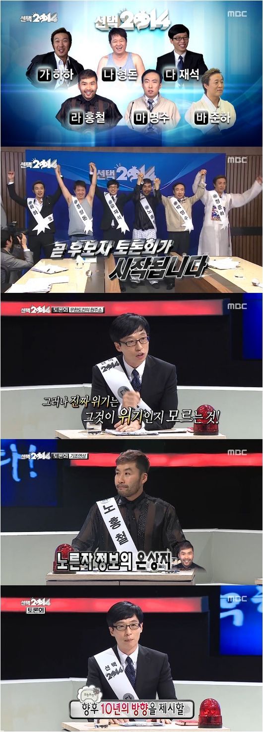 3일 방송된 MBC 예능프로그램 ‘무한도전’은 ‘선택 2014’ 특집으로 방송 9주년을 맞아 ‘무한도전’의 향후 10년을 끌고 가는 차세대 리더를 뽑는 과정이 담겼다.