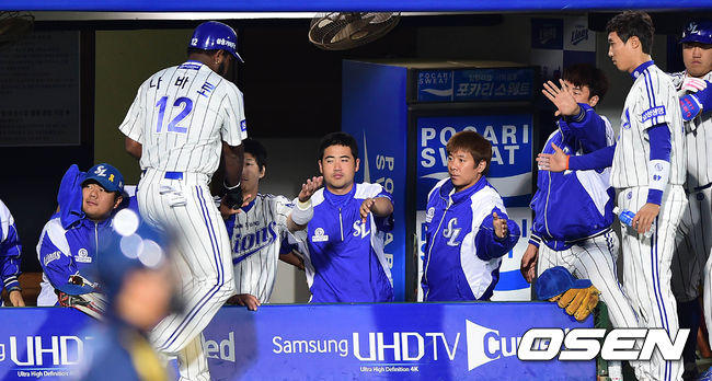 7회말 2사 1,2루에서 삼성 김태완의 좌전 적시타때 홈을 밟은 2루주자 나바로가 더그아웃에서 동료들과 환호하고 있다.
