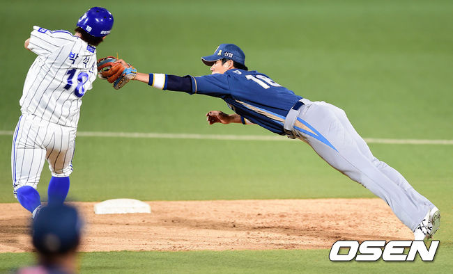 8회말 무사 1루 NC 손시헌이 이승엽의 타구를 놓치자 뒤늦게 2루로 향한 1루주자 박석민이 모창민에게 포스아웃 처리되고 있다.