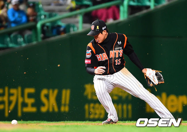 2일 오후 인천 문학구장에서 열린 '2014 한국야쿠르트 세븐 프로야구' SK 와이번스와 롯데 자이언츠의 경기, 8회말 2사 1,2루 상황. 롯데 3루수 황재균이 최정의 타구를 놓치는 실책을 저지르고 있다.