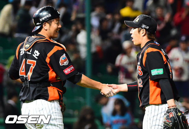 경기종료 후, 승리한 롯데 강민호와 김승회가 기쁨의 하이파이브를 나누고 있다. /ouxou@osen.co.kr