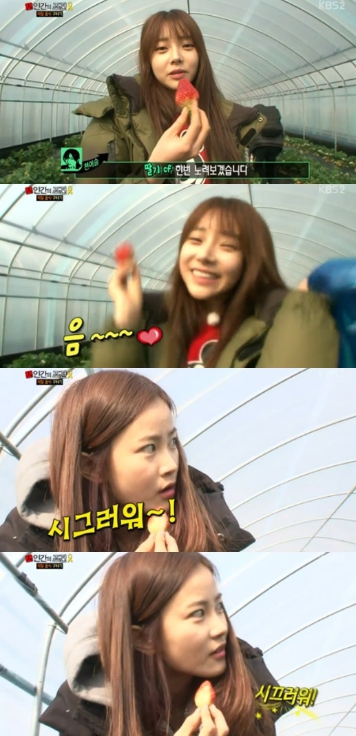 이들은 딸기를 직접 따는 시간을 가졌다. 특히 천이슬은 "딸기 CF를 노려보겠다"며 딸기를 한 입 먹고는 "음~ 시그러워"라고 경상도 사투리로 말해 웃음을 자아냈다.