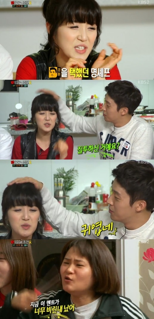 또 허경환과 김지민의 열애설 이야기에, 허경환을 선택했던 명현지 셰프의 표정이 좋지 않자 허경환은 "질투하는 거냐"며 "귀엽네"라고 머리를 쓰다듬어 모두를 경악하게 했다.
