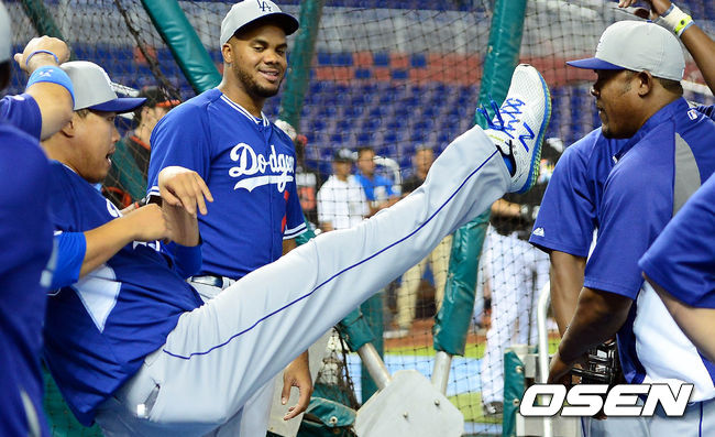 4일(이하 한국시간) 미국 플로리다주 마이애미 말린스 파크에서 열리는 '2014 메이저리그' 마이애미 말린스와 LA 다저스의 경기 시작전 류현진이 유리베에게 발차기를 하며 장난치고 있다.