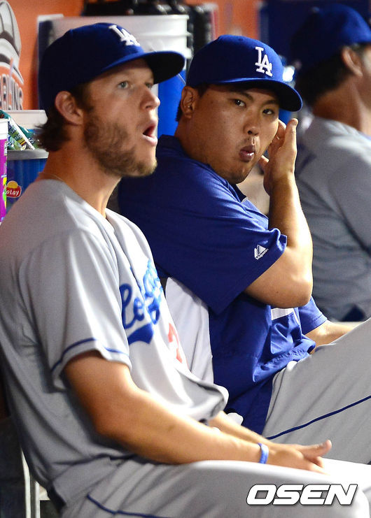 4일(이하 한국시간) 미국 플로리다주 마이애미 말린스 파크에서 열린 '2014 메이저리그' 마이애미 말린스와 LA 다저스의 경기 시작전 류현진과 커쇼가 덕아웃에 앉아 있다.