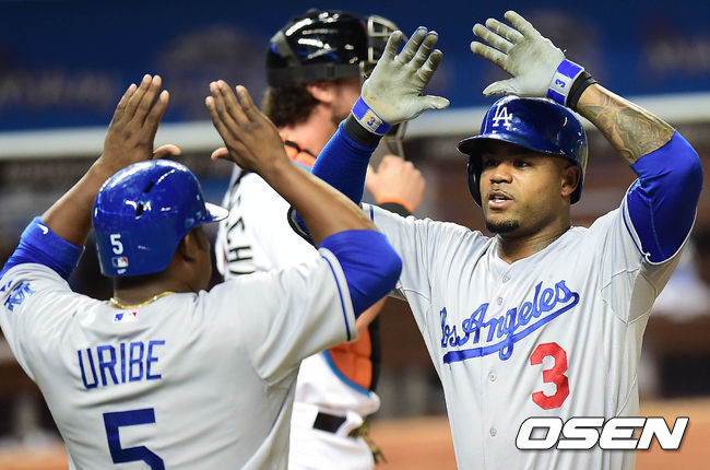 4일(이하 한국시간) 미국 플로리다주 마이애미 말린스 파크에서 열린 '2014 메이저리그' 마이애미 말린스와 LA 다저스의 경기 11회초 1사 1루 크로포드가 투런포를 치고 유리베와 하이파이브를 하고 있다.