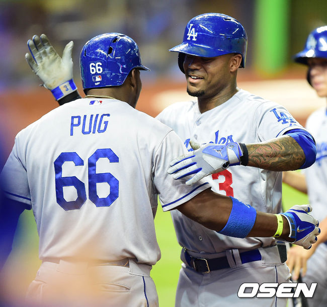 4일(이하 한국시간) 미국 플로리다주 마이애미 말린스 파크에서 열린 '2014 메이저리그' 마이애미 말린스와 LA 다저스의 경기 11회초 1사 1루 크로포드가 투런포를 치고 덕아웃으로 향하며 푸이그와 포옹을 하고 있다.