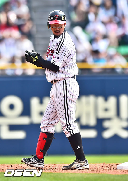 4일 오후 서울 잠실구장에서 열린 '2014 한국야쿠르트 세븐 프로야구' LG 트윈스와 두산 베어스의 경기, 2회말 1사 1,3루 LG 이병규가 선취 2타점 적시타를 날리고 박수를 치고 있다.