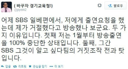 변희재는 4일 트위터에 '어제 SBS 일베 편에서, 저에게 출연 요청을 했는데 제가 거절했다고 방송했나 보군요. 두 가지 이유입니다. 첫째 저는 1월부터 방송출연을 100% 중단한 상태입니다. 둘째, 그간 SBS 그것이 알고 싶다 팀의 거짓조작 전과 탓'이라고 말했다.
