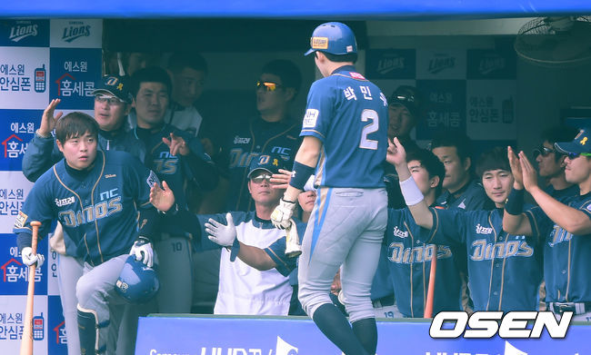 1회초 1사 1,3루에서 NC 이호준의 희생플라이때 홈을 밟은 3루주자 박민우가 더그아웃에서 동료들과 하이파이브를 하고 있다.