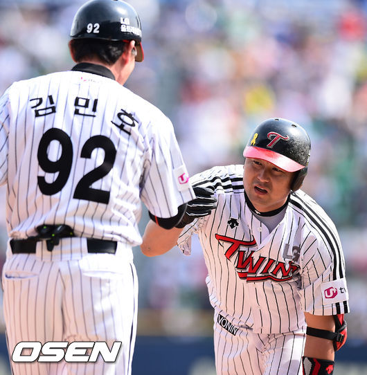 4일 오후 서울 잠실구장에서 열린 '2014 한국야쿠르트 세븐 프로야구' LG 트윈스와 두산 베어스의 경기,3회말 2사 2,3루 LG 최경철이 2타점 적시타를 날리고 김민호 코치와 하이파이브를 하고 있다.