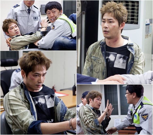 공개된 사진 속 수갑을 찬 강지환은 한바탕 주먹다짐이라도 한 듯 잔뜩 헝클어진 머리와 상처 난 얼굴로 파출소 순경과 몸싸움을 벌이고 있어 눈길을 끈다.