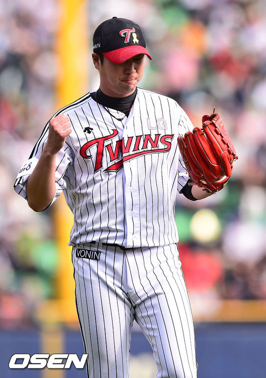 4일 오후 서울 잠실구장에서 열린 '2014 한국야쿠르트 세븐 프로야구' LG 트윈스와 두산 베어스의 경기,6회초 2사 1,2루 실점 위기를 넘긴 LG 선발투수 우규민이 주먹을 쥐며 환호하고 있다.