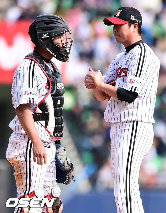 4일 오후 서울 잠실구장에서 열린 '2014 한국야쿠르트 세븐 프로야구' LG 트윈스와 두산 베어스의 경기,6회초 2사 상황에서 김현수에게 몸에 맞는 공, 칸투에게 볼넷을 허용한 LG 선발투수 우규민이 최경철 포수와 이야기를 나누고 있다.