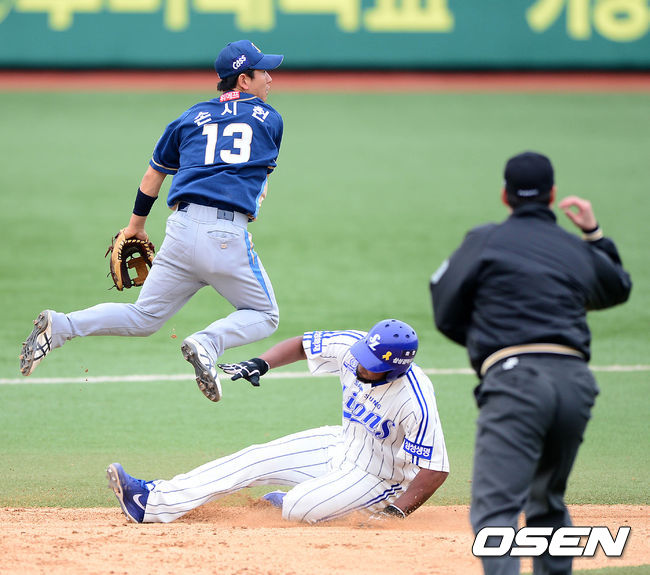 7회말 무사 1,2루에서 NC 손시헌이 삼성 박한이를 병살타로 처리하고 있다.