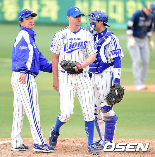 8회초 2사 1루에서 삼성 마틴이 마운드를 내려가고 있다.