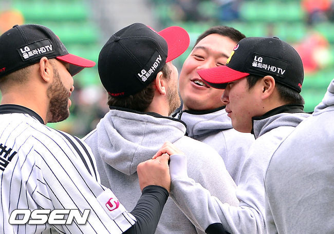 경기종료 후 LG 선수들이 우규민의 첫승을 축하해주고 있다./ soul1014@osen.co.kr