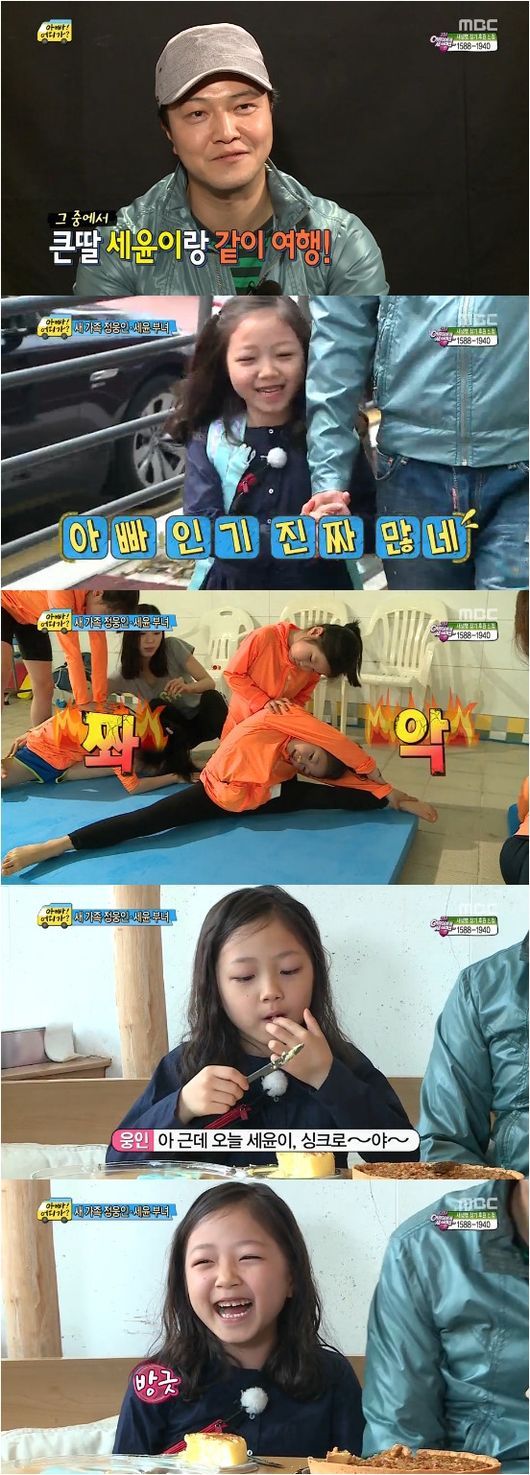 정웅인은 4일 방송된 MBC 예능프로그램 ‘일밤-아빠 어디가’에서 딸 정세윤과 첫 등장을 했다. 이날 정웅인은 딸이 싱크로나이즈드 교육을 하는 수영장에 따라갔다. 정세윤은 스트레칭을 하면서도 꺄르르 웃음이 끊이지 않았다.