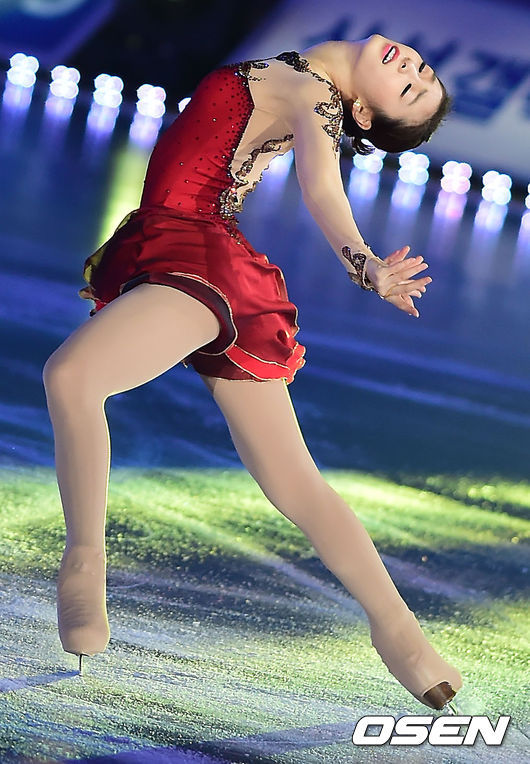 김연아의 순서가 오기 전, 다시 한 번 팬을 향한 그의 메시지가 화면을 가득 채웠다. 팬에게 전하는 ‘고마움’과 ‘사랑’의 인사가 끝난 후 2부 마지막 순서로 은반 위에 등장한 김연아는 붉은 색 드레스에 어깨와 가슴, 등라인으로 이어지는 금색 비즈가 어우러진 화려한 드레스를 선보였다.