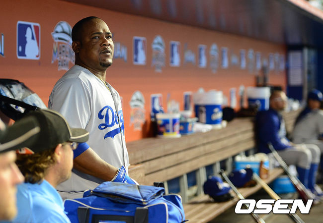 5일(이하 한국시간) 미국 플로리다주 마이애미 말린스 파크에서 열린 '2014 메이저리그' 마이애미 말린스와 LA 다저스의 경기, 유리베가 덕아웃에서 경기를 지켜보고 있다.