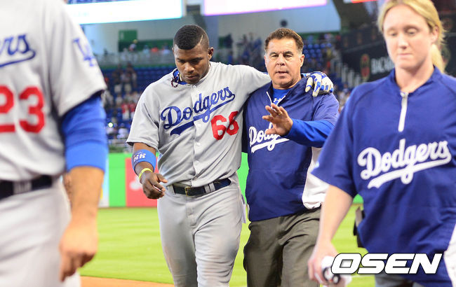 5일(이하 한국시간) 미국 플로리다주 마이애미 말린스 파크에서 열린 '2014 메이저리그' 마이애미 말린스와 LA 다저스의 경기 9회말 2사 3루 베이커의 우전 2루타를 잡으려다 펜스에 충돌한 푸이그가 부축을 받으며 덕아웃으로 향하고 있다.