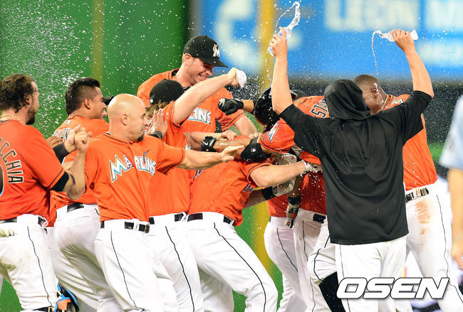 5일(이하 한국시간) 미국 플로리다주 마이애미 말린스 파크에서 열린 '2014 메이저리그' 마이애미 말린스와 LA 다저스의 경기 9회말 2사 3루 베이커가 끝내기 안타를 치고 동료들과 기쁨을 나누고 있다.