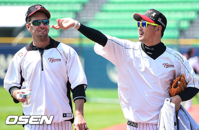5일 오후 서울 잠실구장에서 열린 '2014 한국야쿠르트 세븐 프로야구' LG 트윈스와 두산 베어스의 경기전 LG 봉중근과 티포드가 이야기를 나누고 있다.
