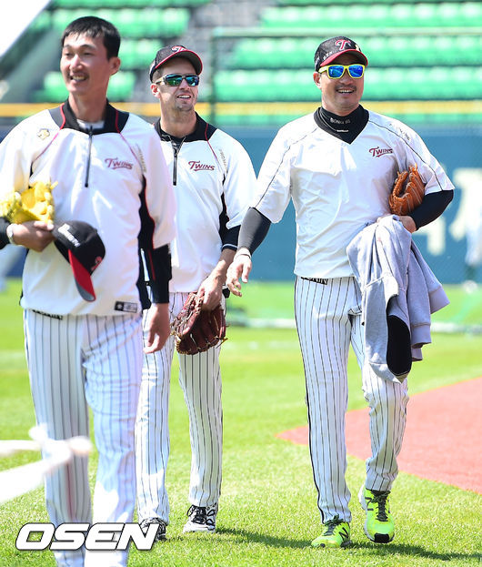 5일 오후 서울 잠실구장에서 열린 '2014 한국야쿠르트 세븐 프로야구' LG 트윈스와 두산 베어스의 경기전 LG 봉중근과 티포드가 이야기를 나누고 있다.