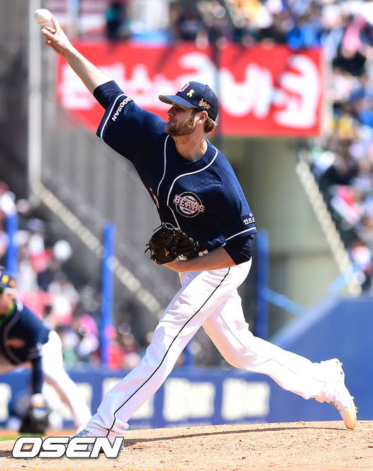 5일 오후 서울 잠실구장에서 열린 '2014 한국야쿠르트 세븐 프로야구' LG 트윈스와 두산 베어스의 경기, 1회말 두산 선발투수 볼스테드가 역투하고 있다.