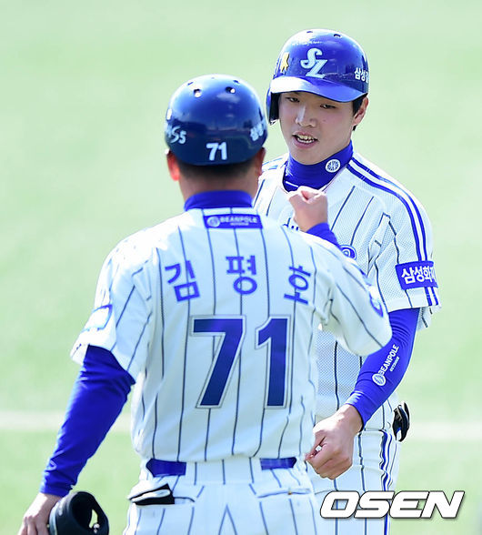 4회말 2사 2루 삼성 정형식이 우전 적시타를 치고 김평호 코치와 하이파이브를 하고 있다.