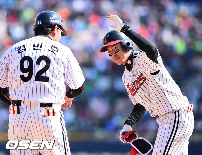 5일 오후 서울 잠실구장에서 열린 '2014 한국야쿠르트 세븐 프로야구' LG 트윈스와 두산 베어스의 경기,5회초 2사 1,2루 LG 백창수가 1타점 적시타를 날린후 김민호 코치와 하이파이브를 하고 있다.