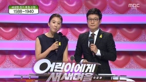 배우 김희애와 방송인 김성주가 노란 리본을 달고 어린이날 특집 프로그램을 진행했다.