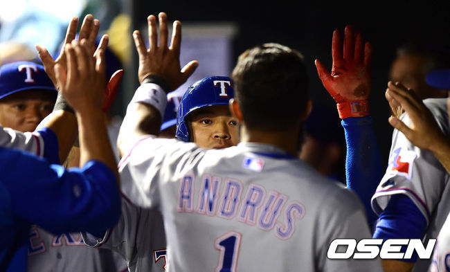 6일(이하 한국시각) 미국 콜로라도주 덴버 쿠어스 필드에서 열린 '2014 메이저리그' 콜로라도 로키스와 텍사스 레인저스의 경기 6회초 무사 3루 윌슨의 내야땅볼에 추신수가 득점 후 동료들과 하이파이브를 하고 있다.
