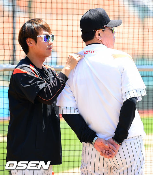 6일 오후 부산 사직구장에서 열린 '2014 한국야쿠르트 세븐 프로야구' 롯데 자이언츠와 두산 베어스의 경기에 앞서 롯데 김시진 감독이 트레이너에게 안마를 받고 있다.
