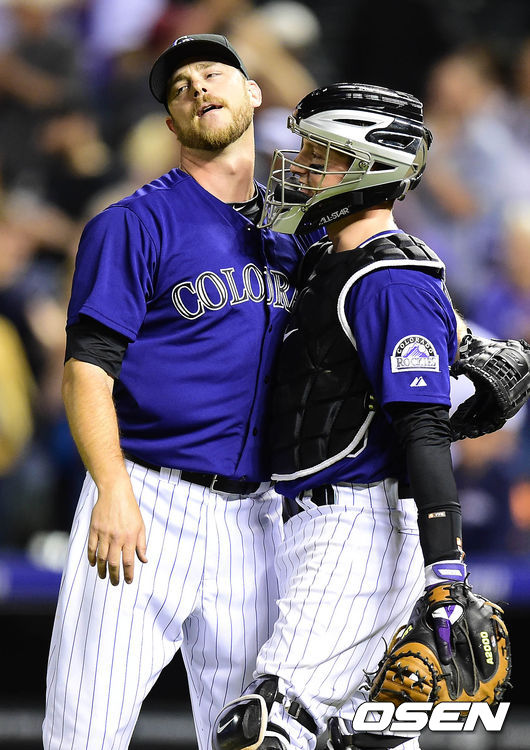 6일(이하 한국시각) 미국 콜로라도주 덴버 쿠어스 필드에서 열린 '2014 메이저리그' 콜로라도 로키스와 텍사스 레인저스의 경기 종료 후 닉 마셋과 조단 파체코가 승리를 기쁨을 나누고 있다.
