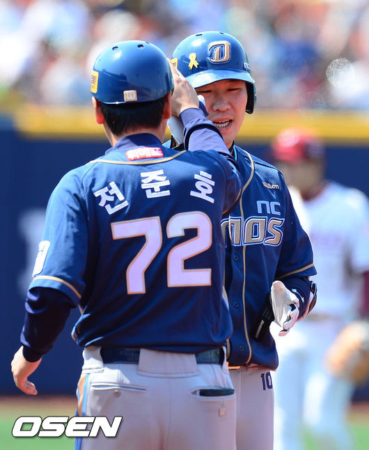 6일 오후 서울 목동구장에서 열린 ‘2014 한국야쿠르트 세븐 프로야구’ 넥센 히어로즈와 NC 다이노스의 경기, 2회초 1사 주자 만루 NC 지석훈이 좌익수 뒤 선취 2타점 적시타를 날린 후 2루에서 전준호 코치와 하이파이브를 하고 있다.