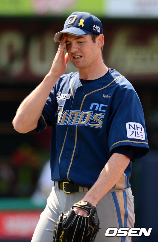 6일 오후 서울 목동구장에서 열린 ‘2014 한국야쿠르트 세븐 프로야구’ 넥센 히어로즈와 NC 다이노스의 경기, 2회말 마친 NC 선발 찰리가 땀을 닦으며 덕아웃으로 향하고 있다.
