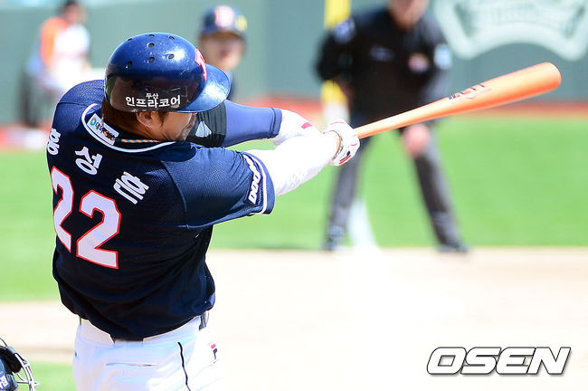 6일 오후 부산 사직구장에서 열린 '2014 한국야쿠르트 세븐 프로야구' 롯데 자이언츠와 두산 베어스의 경기, 1회초 2사 1,3루 두산 홍성흔이 1000타점을 올리는 안타를 날리고 있다.