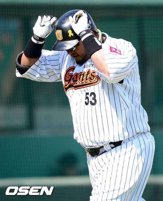 6일 오후 부산 사직구장에서 열린 '2014 한국야쿠르트 세븐 프로야구' 롯데 자이언츠와 두산 베어스의 경기, 2회말 무사 2루 히메네스가 중월 투런 홈런을 날린후 홈에서 세레모니를 펼치고 있다.