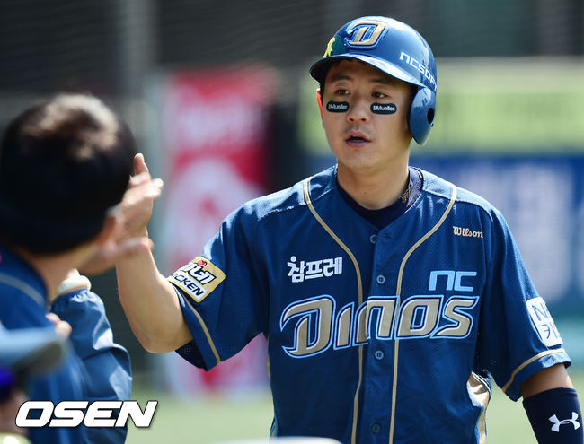 6일 오후 서울 목동구장에서 열린 ‘2014 한국야쿠르트 세븐 프로야구’ 넥센 히어로즈와 NC 다이노스의 경기, 4회초 2사 주자 1,2루 NC 이종욱의 좌익수 왼쪽 1타점 적시타때 홈을 밟은 손시헌이 덕아웃에서 동료들과 하이파이브를 하고 있다.