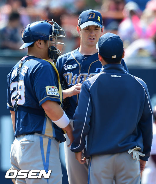 6일 오후 서울 목동구장에서 열린 ‘2014 한국야쿠르트 세븐 프로야구’ 넥센 히어로즈와 NC 다이노스의 경기, 4회말 1사 주자 1루 넥센 이성열 타석에서 NC 선발 찰리와 허준이 마운드 위에서 얘기를 나누고 있다.