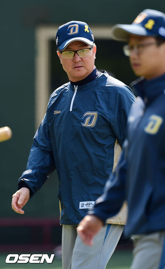 6일 오후 서울 목동구장에서 열린 ‘2014 한국야쿠르트 세븐 프로야구’ 넥센 히어로즈와 NC 다이노스의 경기, 4회말 1사 주자 1루 넥센 이성열 타석에서 NC 김경문 감독이 덕아웃 밖으로 나와 선발 찰리에게 지시를 내린 후 들어가고 있다.