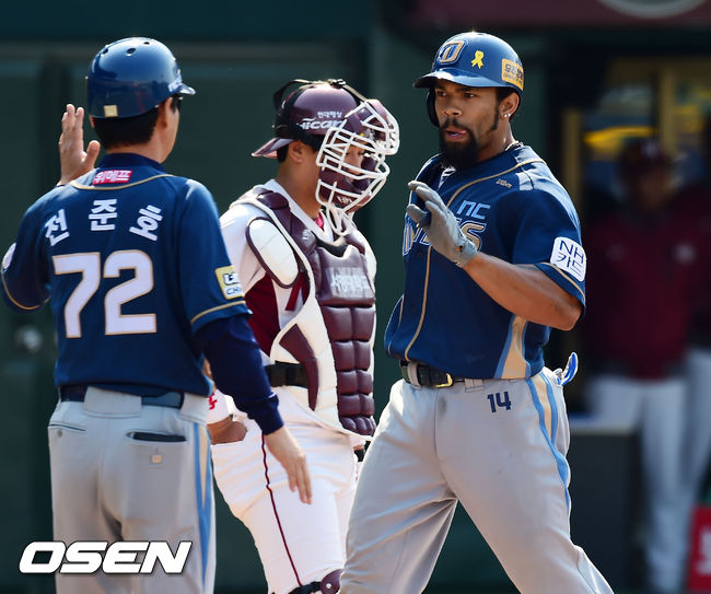 6일 오후 서울 목동구장에서 열린 ‘2014 한국야쿠르트 세븐 프로야구’ 넥센 히어로즈와 NC 다이노스의 경기, 5회초 무사 주자 2루 NC 테임즈가 우월 투런 홈런을 날린 후 홈에서 전준호 코치와 하이파이브를 하고 있다.