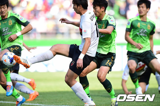 전반 포항 고무열이 전북 수비진을 뚫고 패스를 시도하고 있다.