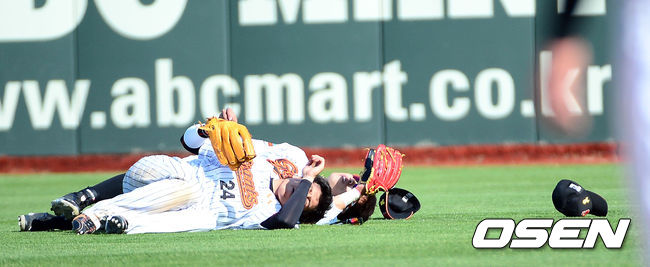 6일 오후 부산 사직구장에서 열린 '2014 한국야쿠르트 세븐 프로야구' 롯데 자이언츠와 두산 베어스의 경기, 5회초 1사 주자없는 상황에서 두산 민병헌의 타구를 잡으려다 충돌한 롯데 김문호와 전준우가 고통을 호소하고 있다.