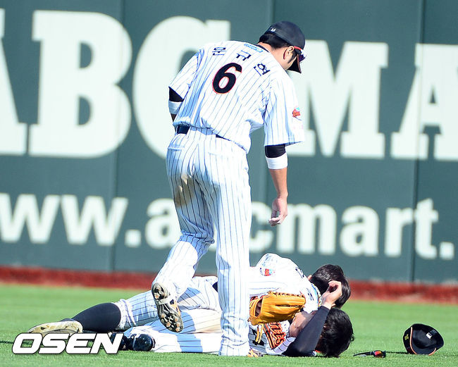 6일 오후 부산 사직구장에서 열린 '2014 한국야쿠르트 세븐 프로야구' 롯데 자이언츠와 두산 베어스의 경기, 5회초 1사 주자없는 상황에서 두산 민병헌의 타구를 잡으려다 충돌한 롯데 김문호와 전준우가 고통을 호소하고 있다.