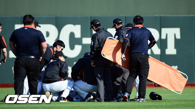 6일 오후 부산 사직구장에서 열린 '2014 한국야쿠르트 세븐 프로야구' 롯데 자이언츠와 두산 베어스의 경기, 5회초 1사 주자없는 상황에서 두산 민병헌의 타구를 잡으려다 충돌한 롯데 김문호와 전준우가 고통을 호소하고 있다.