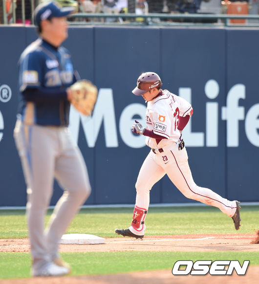 6일 오후 서울 목동구장에서 열린 ‘2014 한국야쿠르트 세븐 프로야구’ 넥센 히어로즈와 NC 다이노스의 경기, 8회말 무사 주자 2루 넥센 문우람이 우월 투런 홈런을 날린 후 그라운드를 돌고 있다.