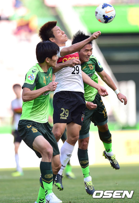 전반 포항 이명주가 전북 김기희, 정혁과 헤딩 경합을 벌이고 있다.